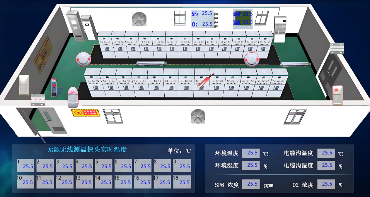 对变压器、高压柜、电缆和低压柜的温度、局放等设备状态信息采集,并结合扩展设备实现电气设备预警联动,对配电房设备实时在线监控。